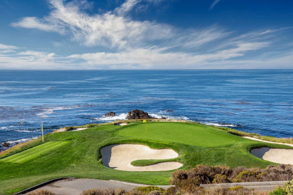 Golfers at Pebble Beach enjoy panoramic ocean views, dramatic cliffs, and a course layout that challenges even